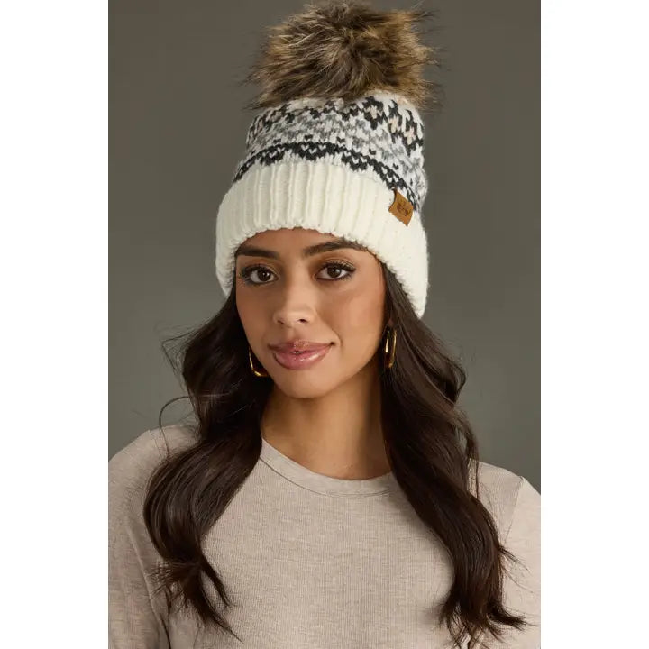 Ivory, Gray & Tan Pattern Pom Hat